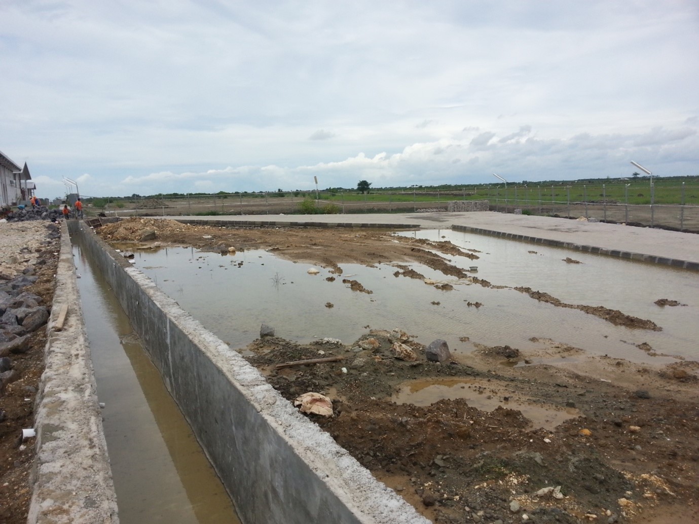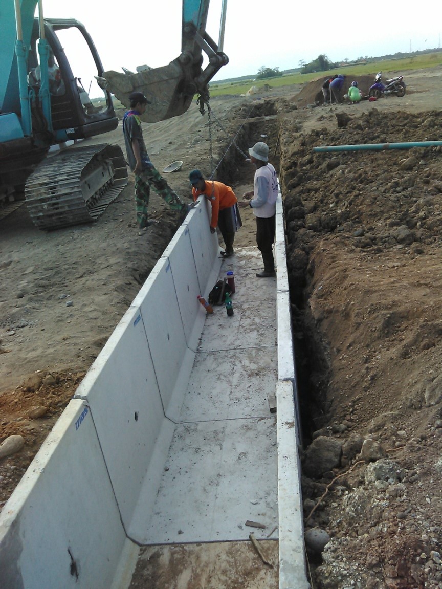 Saluran permanen dibuat sesuai spek di BOQ, apakah menggunakan bahan udtich, atau cor setempat. Ada saluran terbuka, ada saluran tertutup.. Saluran terbuka adalah untuk lokasi taman dan jalur menuju kali atau saluran irigasi setempat.
